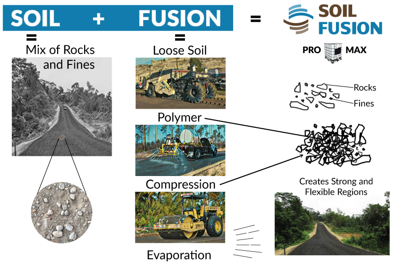 “The most valuable road building product ever developed - for your budget and your environment.” SOIL FUSION™ is a liquid co-polymer solution that is installed using non-specialized equipment. It strengthens the road using native aggregates, eliminating dust and water erosion.
